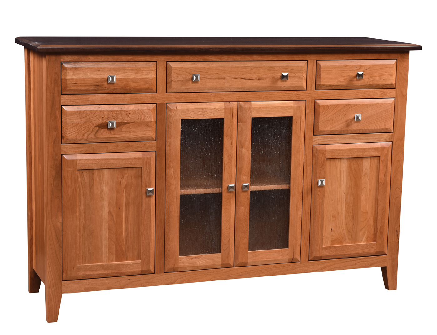 The clean lines of this Shaker buffet make a beautiful statement yet practical addition to your dining room. Choose the wood species, stain color and hardware to fit best with your decor. Seeded glass adds a unique beauty to this buffet, but clear glass is also an option.