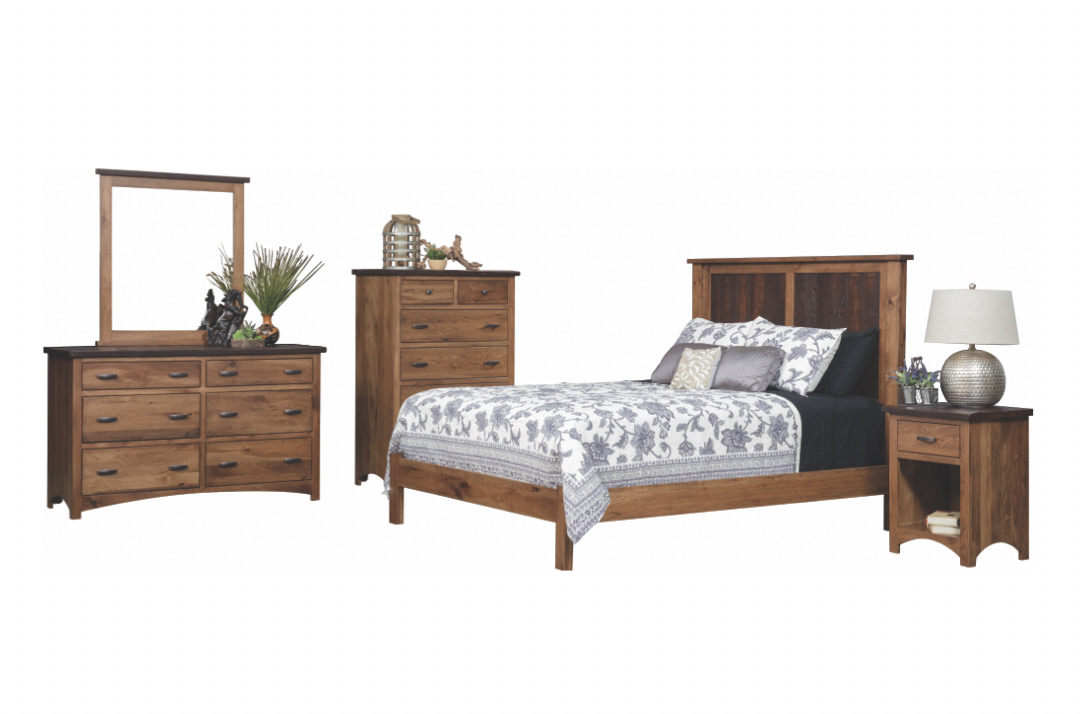 Reclaim your bedroom with the Farmhouse Reclaimed Bedroom furniture. This Amish-crafted bedroom features reclaimed barn wood tops and two tone stain making it a talking point of any home.