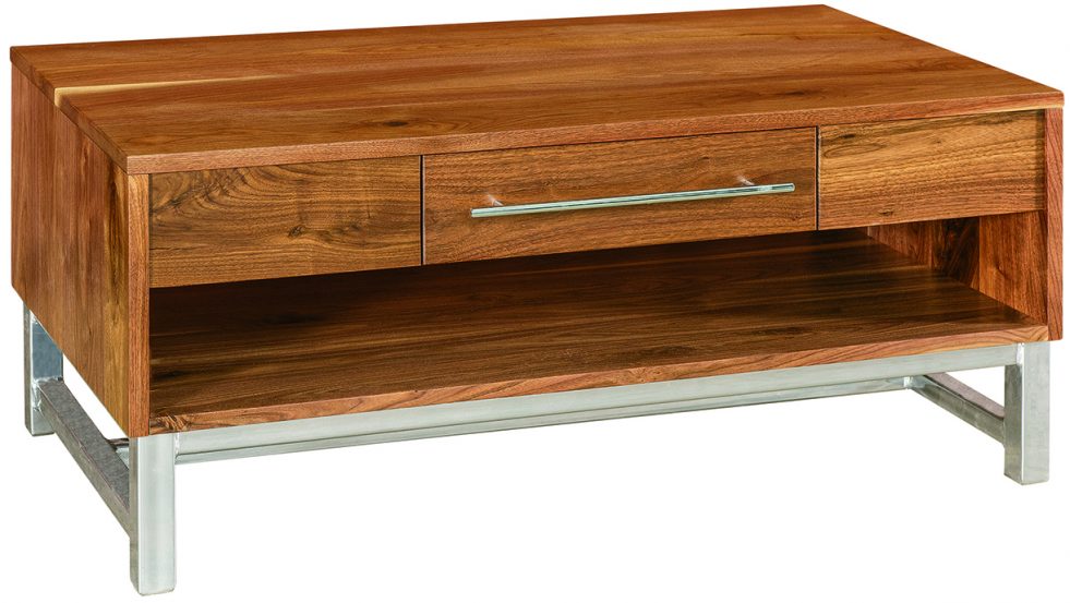 This beautifully crafted modern coffee table is just the perfect thing to make your living space come together. Choose between several different wood species, stain colors, and metal base color.