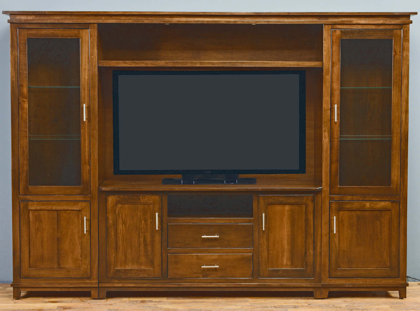 This wall unit is built to last with several different components and parts to efficiently utilize your space while looking beautiful too. With everything customizable from the wood species, hardware, and stain color, customize any number of combinations to make this your own.