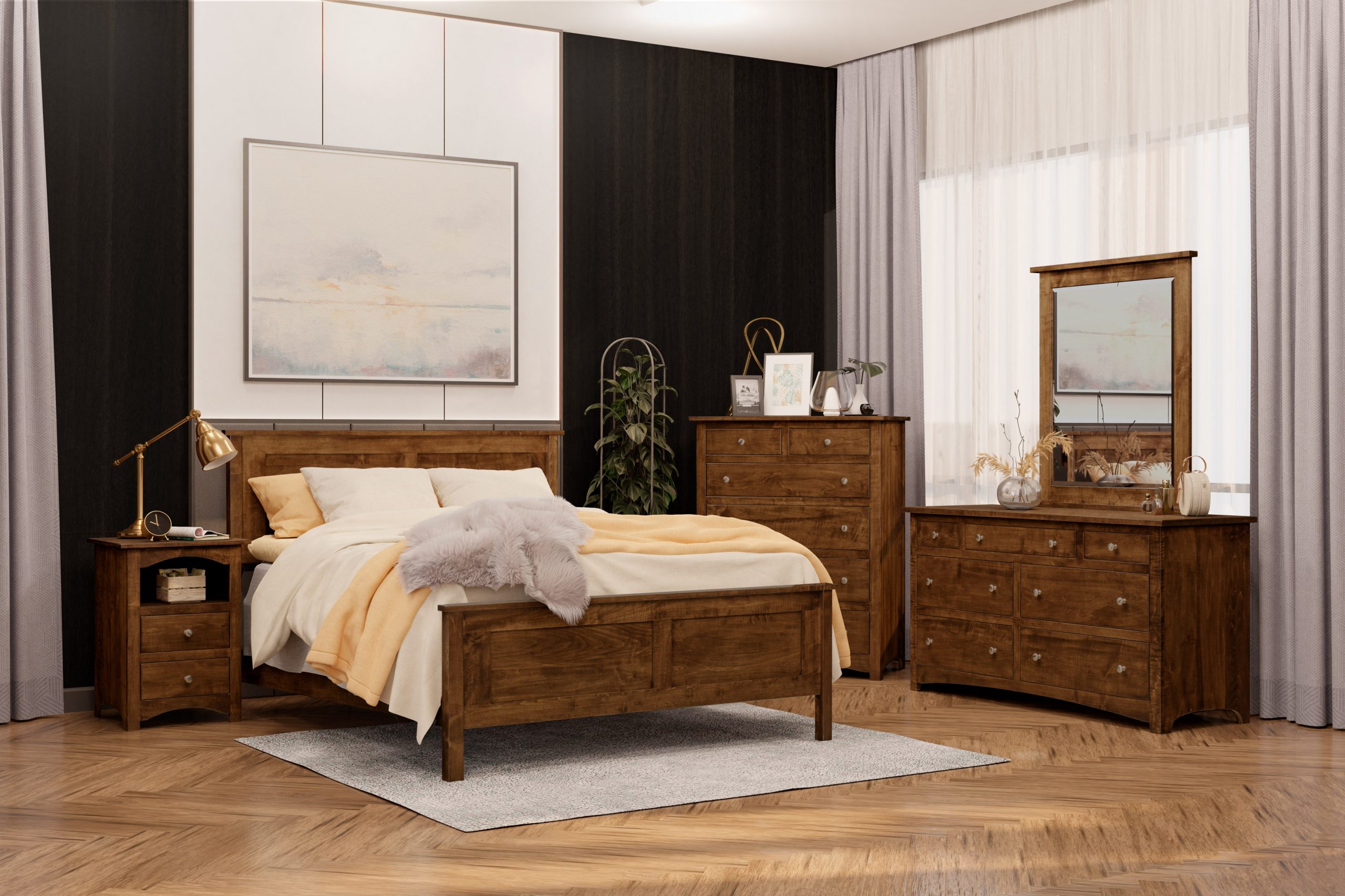 This setting uses century old techniques by Amish master craftsman to create timeless furniture made from natural materials. With everything customizable from the wood species to the hardware and stain color, choose between a number of combinations to make this set your own.